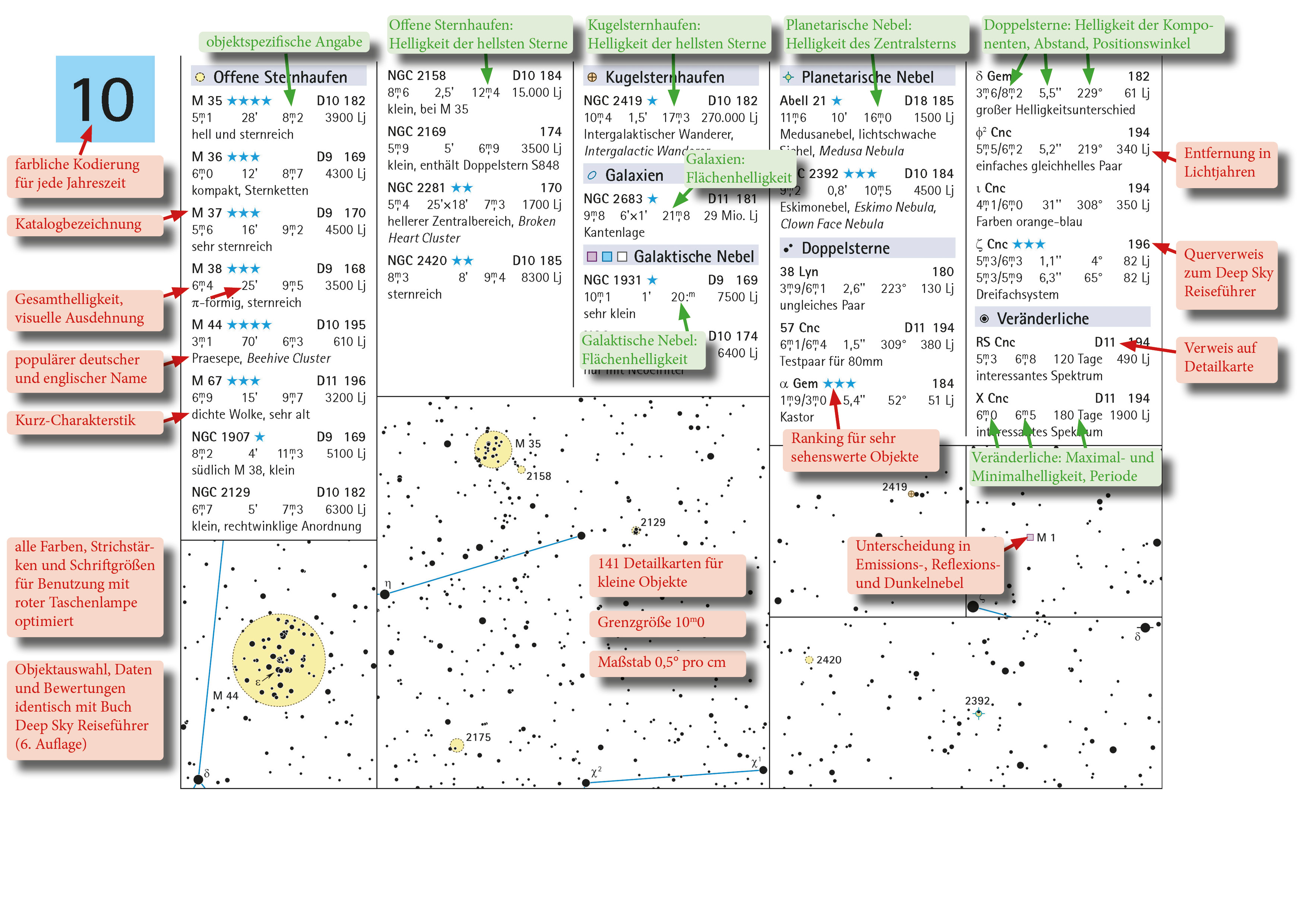Zehntausendfach bewährt: Der »Deep Sky Reiseatlas« ist das einzigartige Werkzeug für das Auffinden von Sternhaufen, Nebeln und Galaxien. Große Übersichtlichkeit, auf die nächtliche Benutzung abgestimmtes Design, wasserabweisende Oberfläche und Ringbindung machen ihn zu einem exzellenten Begleiter auf eigenen Himmels-Touren. 38 Karten decken den gesamten Himmel in einem einheitlichen Maßstab von 2° pro Zentimeter ab. Sie enthalten mehr als 20.000 Sterne bis zur Größenklasse 7,5 und die 666 lohnendsten Sternhaufen, Nebel und Galaxien für Ferngläser und Fernrohre. Über 300 Objekte sind auf Detailkarten im Maßstab von 0,5° pro Zentimeter und einer Grenzgröße von 10,0 abgebildet. Eine wertvolle Hilfe sind die eingedruckten Telrad-Zielkreise, die das sichere Aufsuchen von Himmelsobjekten mit einem Telrad-Peilsucher ermöglichen. Jeder Kartenseite liegt eine umfangreiche Datenseite mit Angaben zu Helligkeit, Ausdehnung, Entfernung und einer Kurzbeschreibung jedes verzeichneten Objekts gegenüber. Zahlreiche Querverweise verbinden den Deep Sky Reiseatlas mit dem Buch "Deep Sky Reiseführer", auf den der Inhalt dieses Kartenwerks abgestimmt ist.