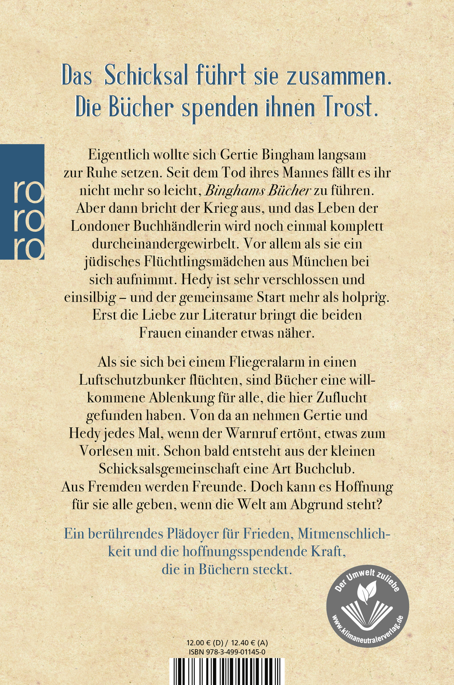 Eigentlich wollte sich Gertie Bingham langsam zur Ruhe setzen. Seit dem Tod ihres Mannes fällt es ihr nicht mehr so leicht, Binghams Bücher zu führen. Aber dann bricht der Krieg aus, und das Leben der Londoner Buchhändlerin wird noch einmal komplett durcheinandergewirbelt. Vor allem als sie ein jüdisches Flüchtlingsmädchen aus München bei sich aufnimmt. Hedy ist sehr verschlossen und einsilbig - und der gemeinsame Start mehr als holprig. Erst die Liebe zur Literatur bringt die beiden Frauen einander etwas näher.