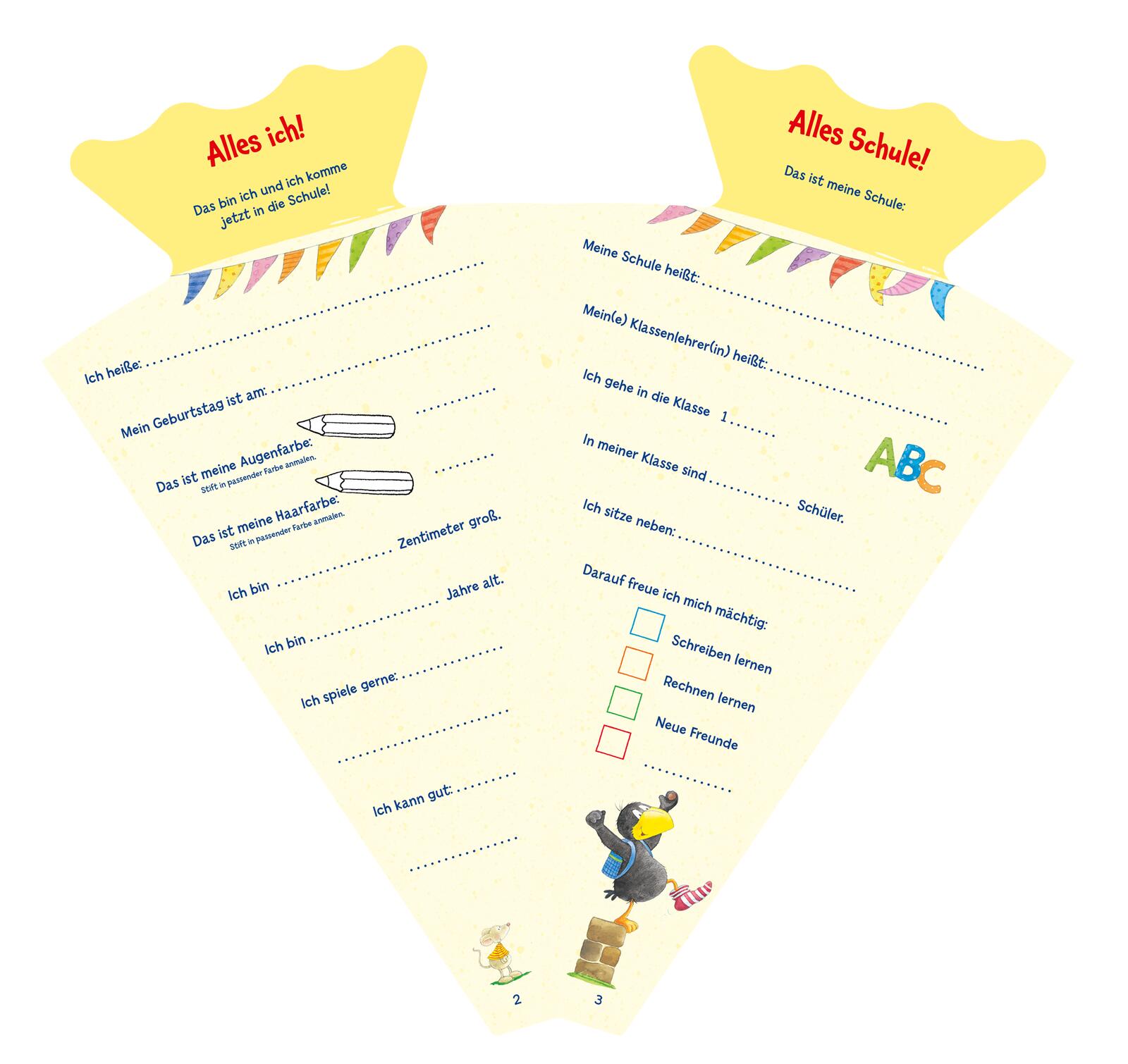 Zusätzlich gibt es Eintrageseiten rund um den ersten Schultag – so wird auch diese Schultüte zur rabenstarken Erinnerung an die Einschulung!