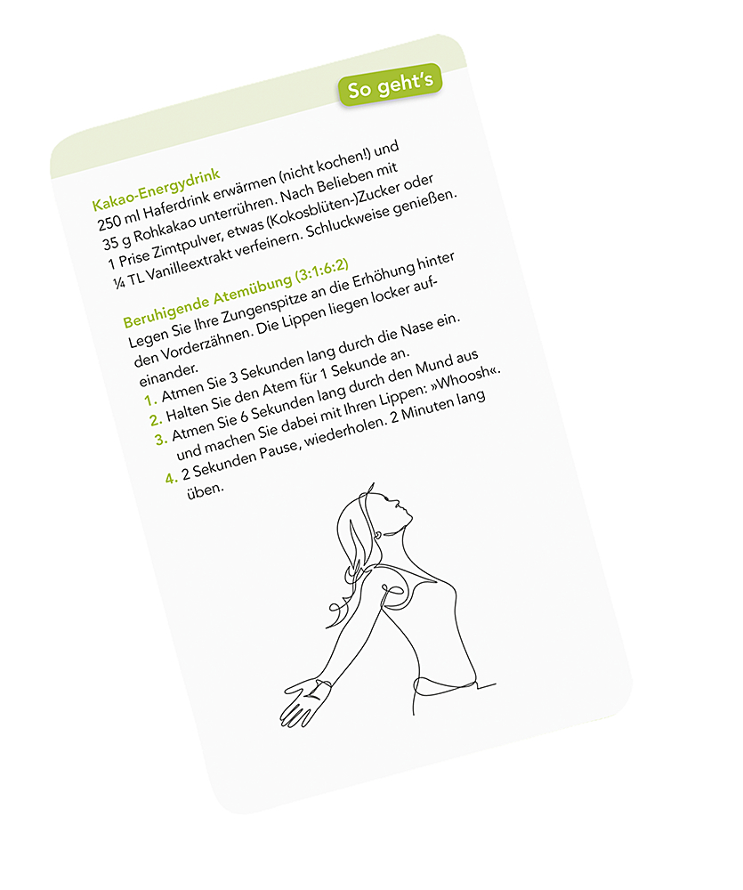 Testen Sie im beiliegende Booklet, was Ihnen am meisten Energie raubt und Nerven kostet aber auch was Ihnen schnell Kraft schenkt und bei der Stressbewältigung helfen kann. Die wissenschaftlich fundierten Kraftmacher bieten besondere Anwendungen, Übungen, Kniffe oder Rezepte. Je öfter Sie einen Kraftmacher üben, desto mehr stärken Sie Ihr psychisches Immunsystem, die Resilienz. Die hochwertig ausgestattete Kartenbox mit Booklet sieht toll aus und passt in jede Handtasche. 21 überraschende Impulse, wenn die Psyche Hilfe braucht.