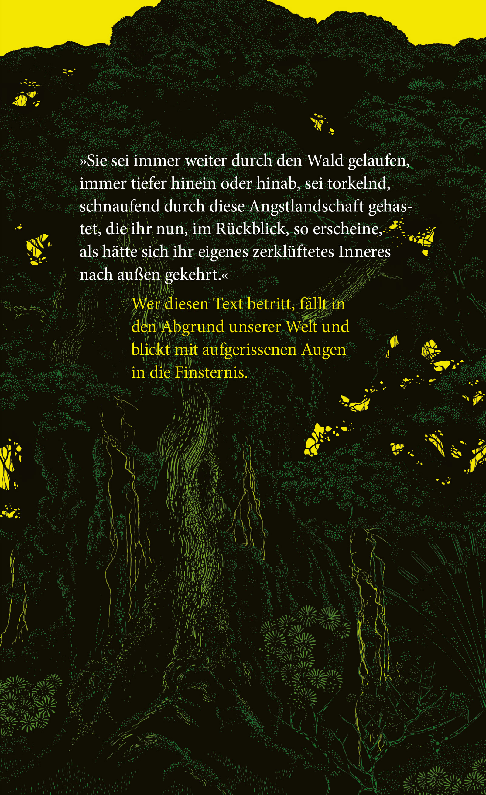 Dorothee Elmigers bildgewaltiger Roman – eine mitreißende Erfahrung. Wer diesen Text betritt, fällt in den Abgrund unserer Welt und blickt mit aufgerissenen Augen in die Finsternis. Ausgezeichnet mit dem Deutschen Buchpreis 2025, nominiert für den Schweizer Buchpreis und den Bayerischen Buchpreis 2025. Mit blinkenden Warnlichtern fährt die Erzählerin, eine namenlose Schriftstellerin, an den Straßenrand, als ein unerwarteter Anruf sie erreicht. Am Apparat ist ein gefeierter Theatermacher, der sie für sein neuestes Vorhaben zu gewinnen versucht – ein in den Tropen angesiedeltes Stück, die Rekonstruktion eines Falls. Wenige Wochen später bricht sie auf, um sich der Theatergruppe auf ihrem Gang ins tiefe Innere des Urwalds anzuschließen. Dorothee Elmiger erzählt eine beunruhigende Geschichte von Menschen und Monstren, von Furcht und Gewalt, von der Verlorenheit im Universum und vom Versagen der Erzählungen.
