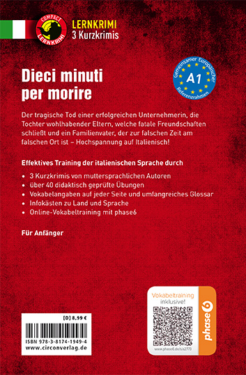 Dieci minuti per morire (Compact Lernkrimi) Ein junges Mädchen aus gutem Hause, das eine verhängnisvolle Bekanntschaft macht, eine Schönheitsoperation mit tödlichen Folgen und ein Theaterbesuch, der das Leben einer Familie für immer verändert. Hochspannung auf Italienisch! Diese drei Kurzkrimis für Anfänger bieten spannendes Lesevergnügen und machen das Italienischtraining unterhaltsam und effektiv. Der Schwerpunkt liegt dabei auf der Grammatik. Durch eingestreute Übungen wie Übersetzungsaufgaben, Multiple Choice, Lückentexte, etc. wird zudem das Textverständnis geschult und der Wortschatz gefestigt. - drei spannende Kurzkrimis - gezieltes Training der italienischen Grammatik - textbezogene Übungen mit Lösungen - Vokabelangaben auf jeder Seite - Infokästen zu Sprache, Grammatik und Landeskunde - Europäischer Referenzrahmen: Für Anfänger - Niveau A1