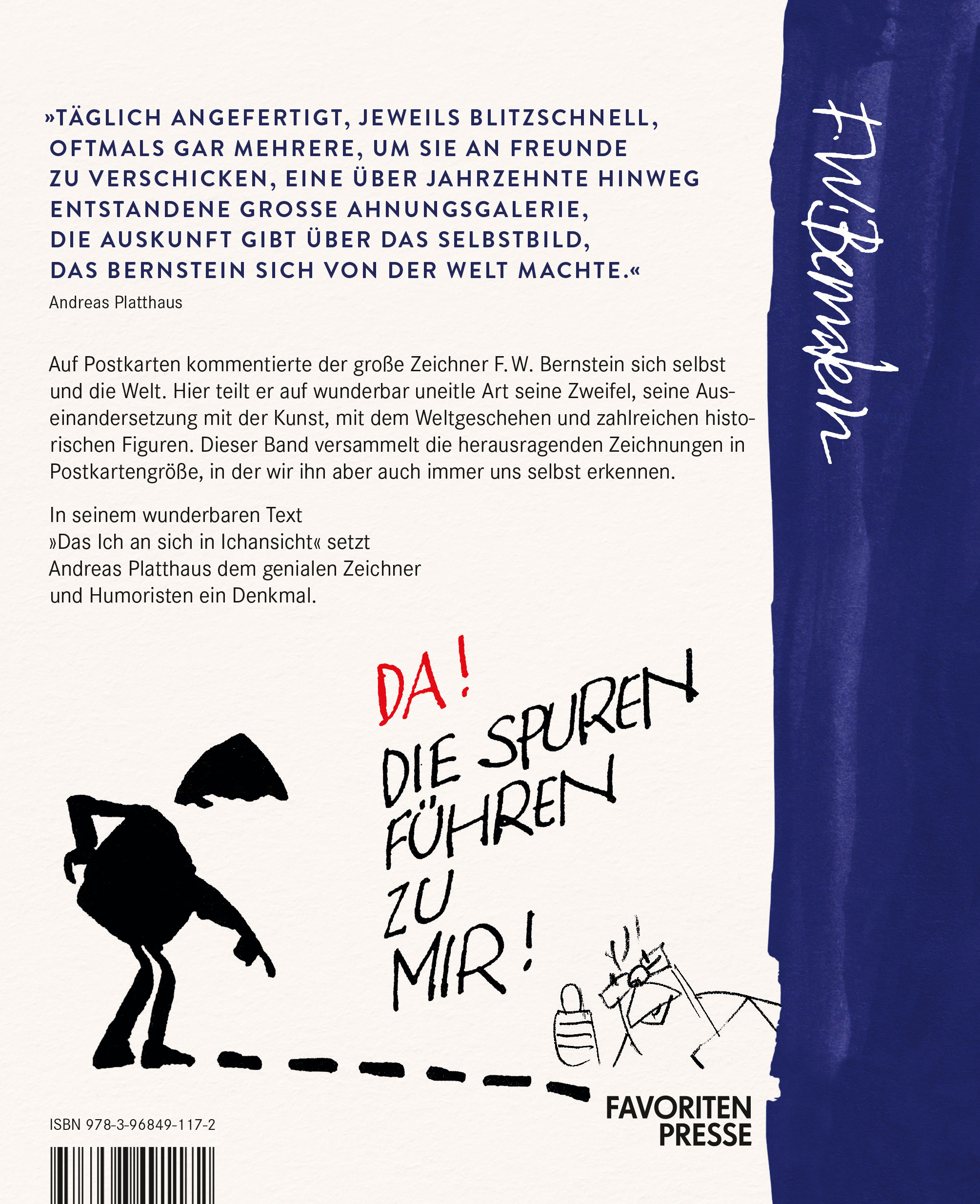 Über Jahrzehnte sammelte sein Freund Henner Drescher diese Kunstwerke in Postkartengröße zusammen: Eine Sisyphusarbeit, die diese wunderbare Publikation in der Favoritenpresse möglich machte. »Aus den gezeichneten Lebenszeichen an die Freunde schuf er gleichsam nebenbei etwas, das, ohne dass er wohl selbst je darüber nachgedacht hätte, genau seinem Künstlernamen entsprach: auf ewig sichtbare Zeugnisse eines Lebens weit über dessen Tod hinaus, eingeschlossen nicht in, aber von Bernstein.« In seinem wunderbaren Vorwort »Das Ich an sich in Ichansicht« setzt Andreas Platthaus dem genialen Zeichner und Humoristen ein Denkmal.