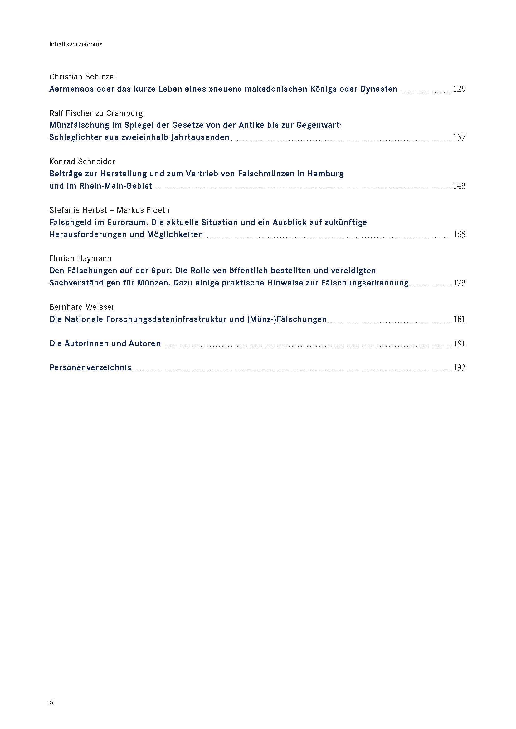 Sechzehn renommierte Autorinnen und Autoren nähern sich aus verschiedenen Blickwinkeln dem Thema Falschmünzen (für den Geldumlauf) und Münzfälschungen (zum Schaden der Sammler). Die Beiträge behandeln Fälschungserkennung und -prävention, historische und rechtliche Aspekte der Falschmünzerei und Münzfälschung sowie einzelne Fälscherpersönlichkeiten, und geben einen Ausblick zur aktuellen Relevanz des Themas.