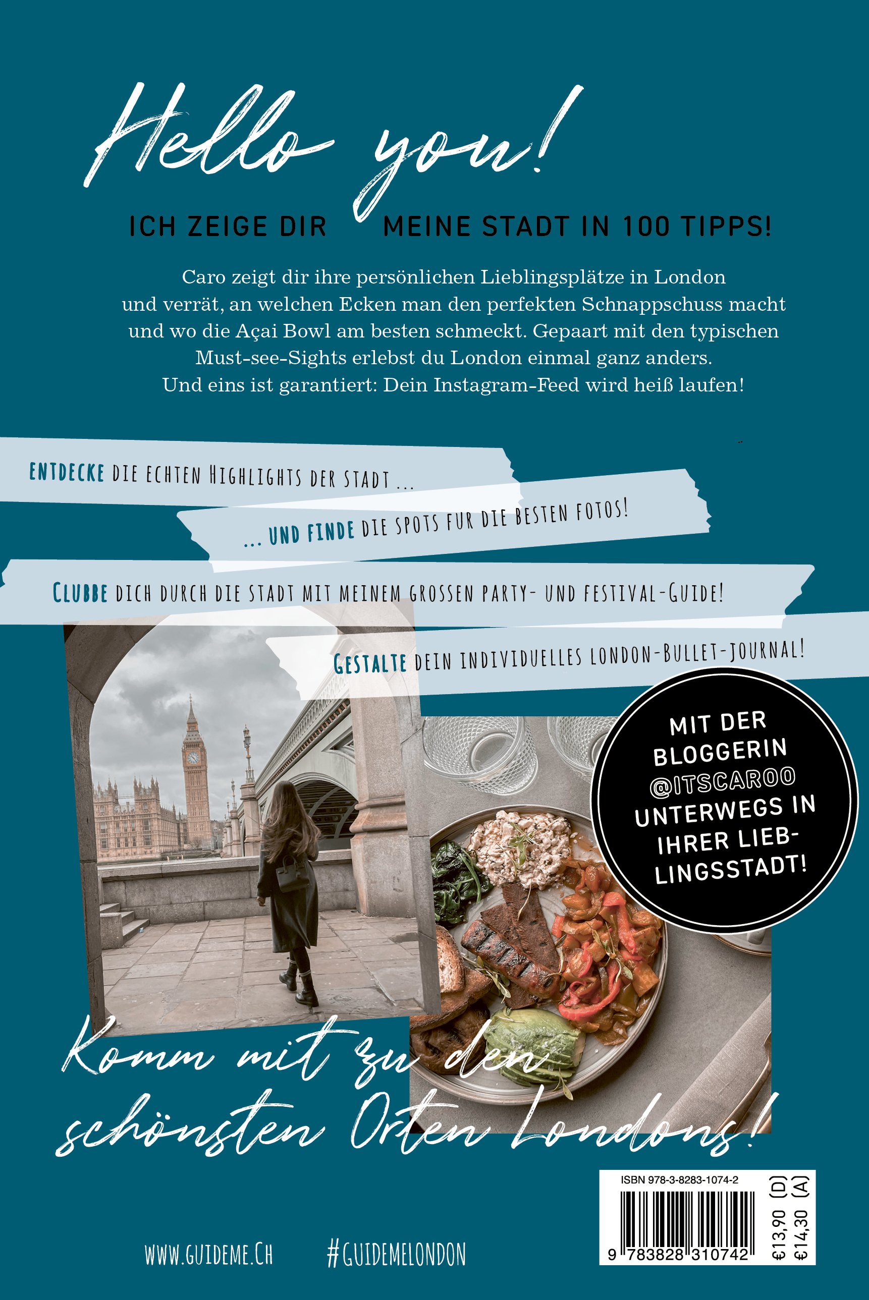 Der Reiseführer einer neuen Generation mit 100 kompakten Tipps. Die Travel-Bloggerin Caroline Julius zeigt dir ihre Lieblingsstadt London, und verrät an welcher Ecke man den perfekten Schnappschuss macht oder wo die Açai Bowl am besten schmeckt! Gepaart mit den typischen Must-See-Sights erlebst du London mit diesem Reiseführer einmal ganz anders. Und eins ist garantiert: Dein Instagram-Feed wird heißlaufen! Im modernen Design, mit individuellen Illustrationen und freien Kreativ-Seiten ist der GuideMe Reiseführer London dabei auch ein echter Hingucker und stylischer Begleiter. > ENTDECKE die echten Highlights der Stadt wie ein Einheimischer > FINDE die besten Spots für die schönsten Fotos > CLUBBE dich durch die Stadt mit dem großen Party- und Festival-Guide > GESTALTE dein individuelles Bullet-Journal auf freien Seiten | Blogger-Tipps | Foto-Hotspots | klassische Sehenswürdigkeiten | Restaurants & Cafés | Shopping | Clubs & Bars | Events & Festivals | Kreativ-Teil zum selber ausfüllen | freie Seiten | Reiseführer mit herausnehmbarer City-Map