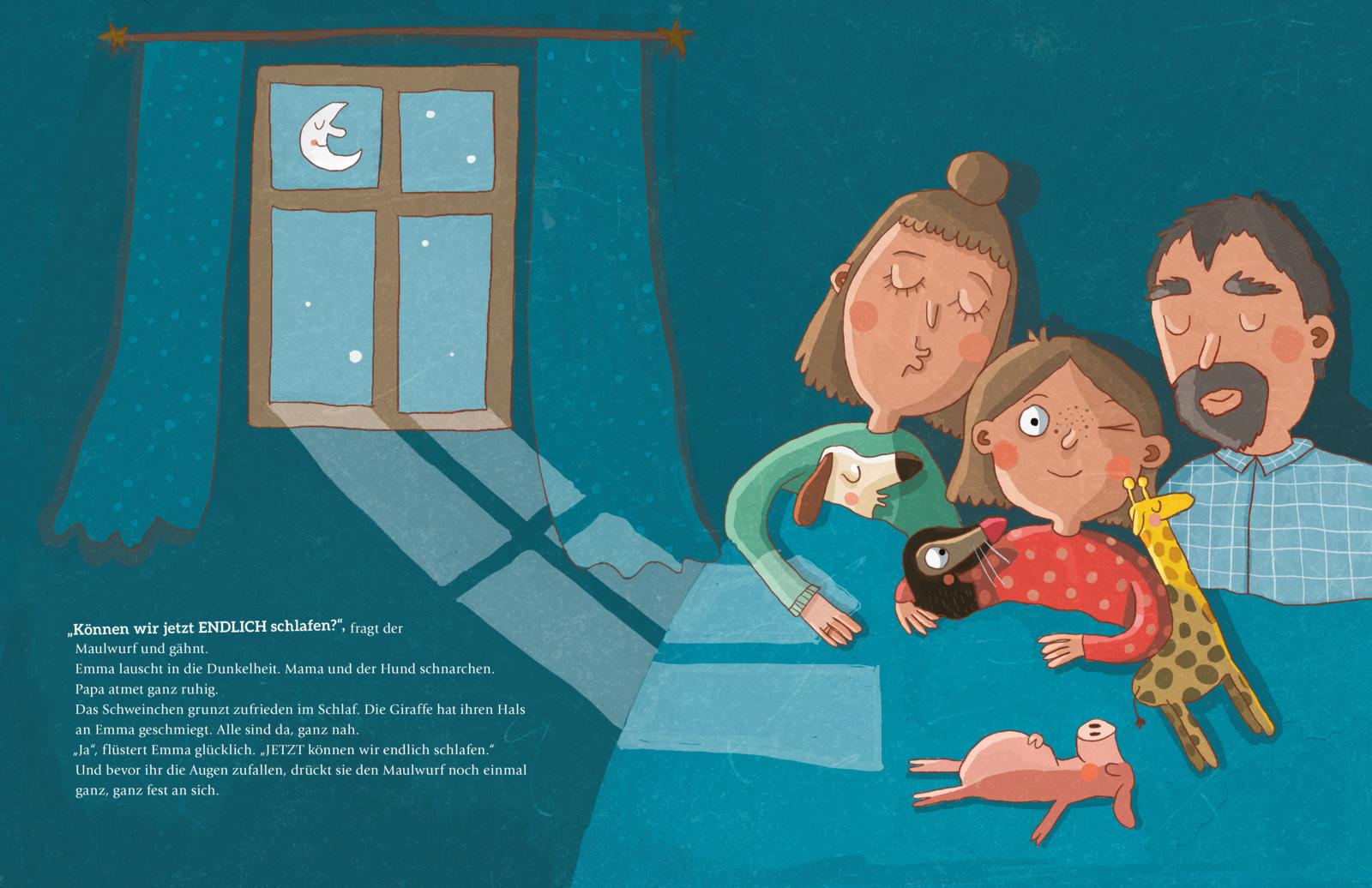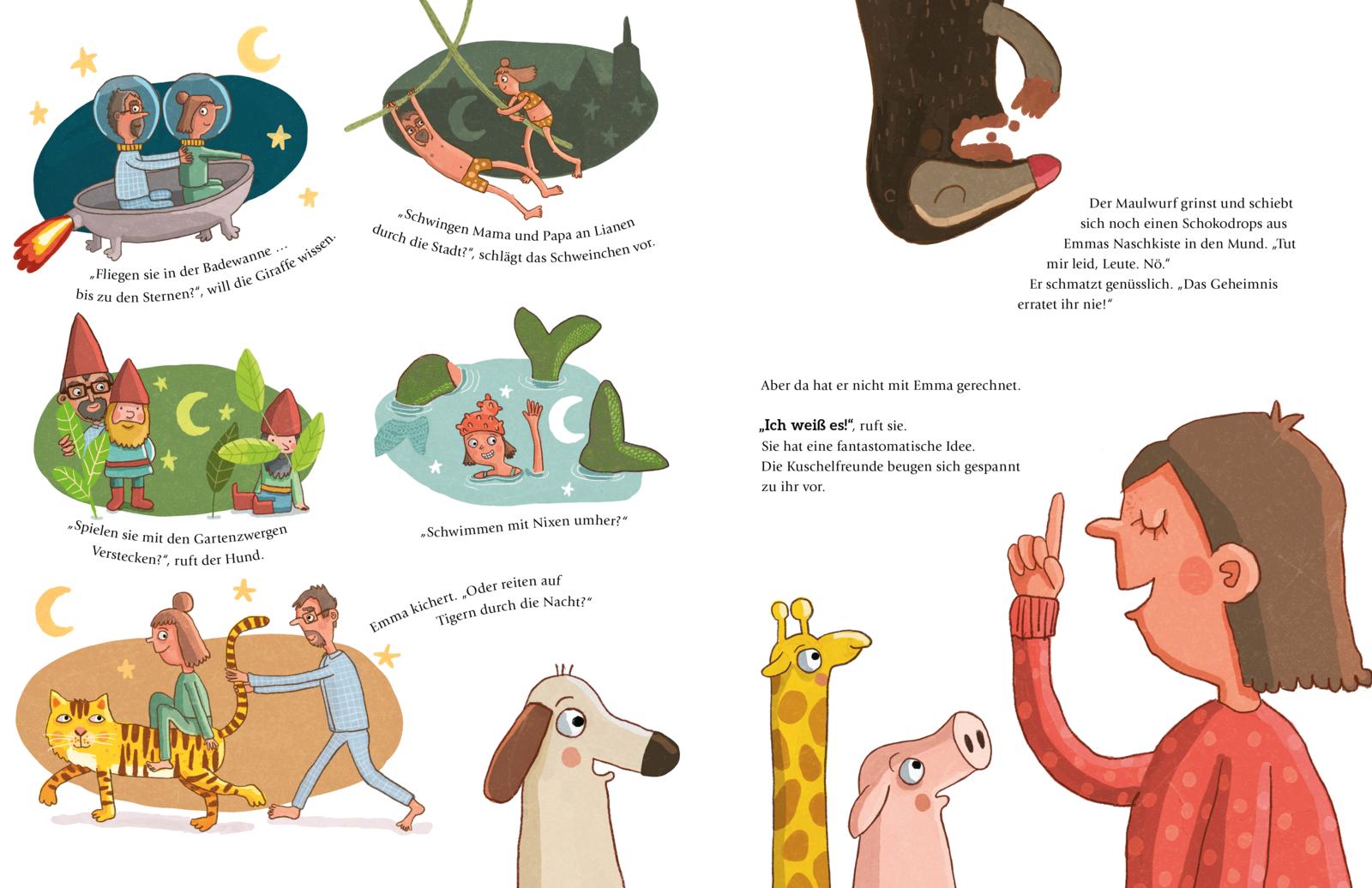 Emma muss mal wieder früh ins Bett! Dabei machen ihre Eltern nachts ganz bestimmt die tollsten Sachen! Auf Tigern reiten, mit Nixen schwimmen oder im Keller eine gigantische Eismaschine bauen. Da hilft nur wachbleiben und nachschauen! Doch immer schlafen Emma und ihre Kuschelfreunde ein. Ob beim Sternezählen, Wattepusten-Turnier oder lustigen Verkleiden. Bis der Maulwurf DIE Idee hat. Und tatsächlich … den Wecker zu stellen, funktioniert! Als sie auf den Flur schleichen, begegnen sie Mama und Papa. Wie jeden Abend wollen sie Emma nur noch einen leisen Gutenachtkuss geben. Wenn das nicht mal ein schönes Geheimnis ist.
