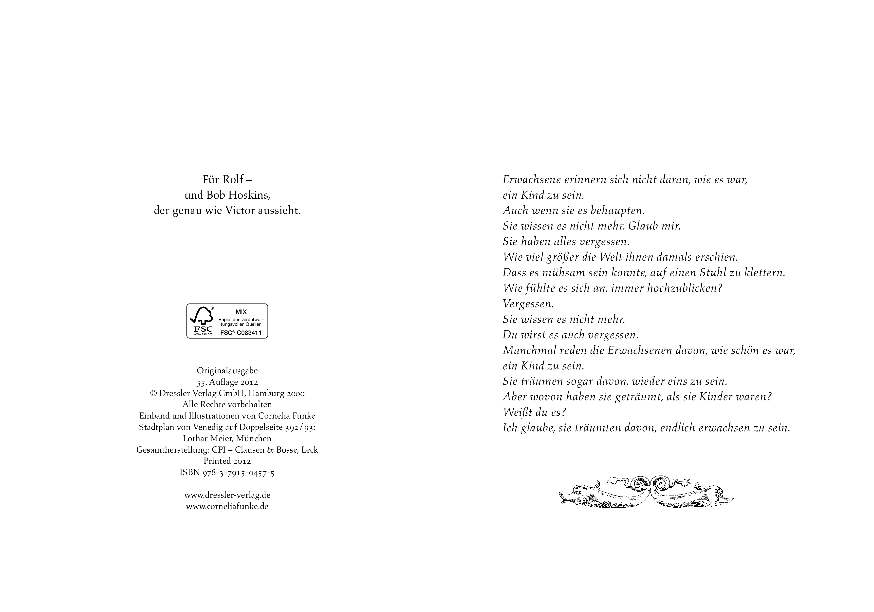 "Du bist also wirklich der Herr der Diebe", sagte der Fremde leise. "Nun gut, behalte deine Maske auf, wenn du dein Gesicht nicht zeigen möchtest. Ich sehe auch so, dass du sehr jung bist." Der Herr der Diebe - das ist der geheimnisvolle Anführer einer Kinderbande in Venedig, die er mit dem Verkauf der Beute aus seinen Raubzügen über Wasser hält. Keiner kennt seinen Namen, seine Herkunft. Auch nicht Prosper und Bo - zwei Ausreißer, die auf der Flucht vor ihrer Tante und dem Detektiv Victor Unterschlupf bei der Bande gefunden haben. Als Victor den Kindern tatsächlich auf die Spur kommt, bringt er dadurch alle in Gefahr. Aber endgültig scheint die Gemeinschaft der Bande aufzubrechen, als ein rätselhafter Auftrag, erteilt von dem mysteriösen "Conte", die Kinder auf eine Laguneninsel führt. Diese Insel, von außen unbewohnt und einsam scheinend, birgt ein Geheimnis, das alles verändert. Cornelia Funke, die schon mit ihrem zum Bestseller gewordenen Titel DRACHENREITER zeigte, welch weiten Atem ihr Erzähltalent hat, hält ihre Leser - gleich welchen Alters - auch mit diesem Buch von der ersten Zeile an gefangen. Sie führt uns durch ein winterliches Venedig, verstrickt uns in verwirrende Rätsel und erfüllt ihren Helden am Schluss einen alten Menschheitstraum
