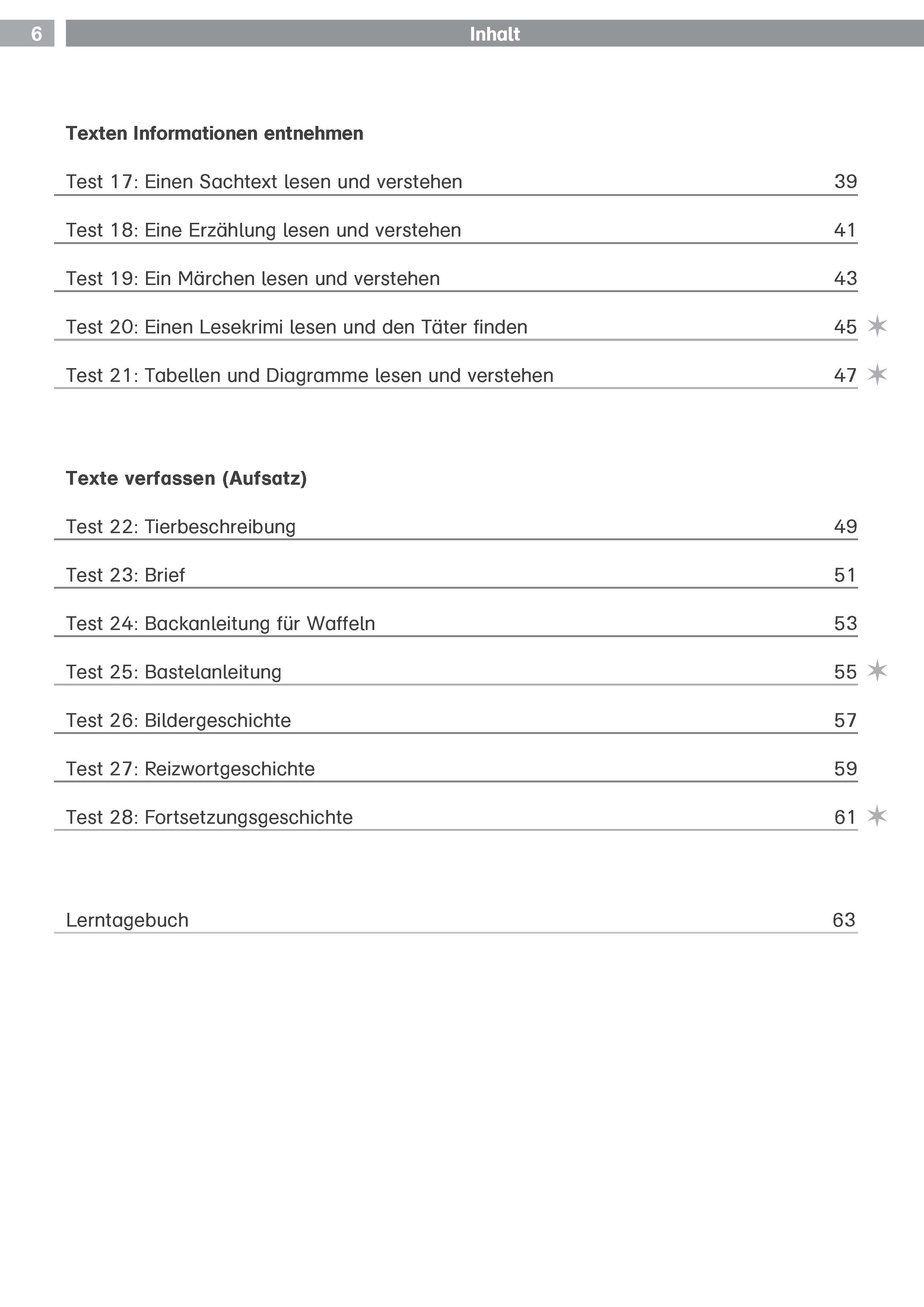 - 28 Deutsch-Tests zu den wichtigsten Themenschwerpunkten: Rechtschreibung, Grammatik, Texte verfassen, Aufsatz, Texten Informationen entnehmen.