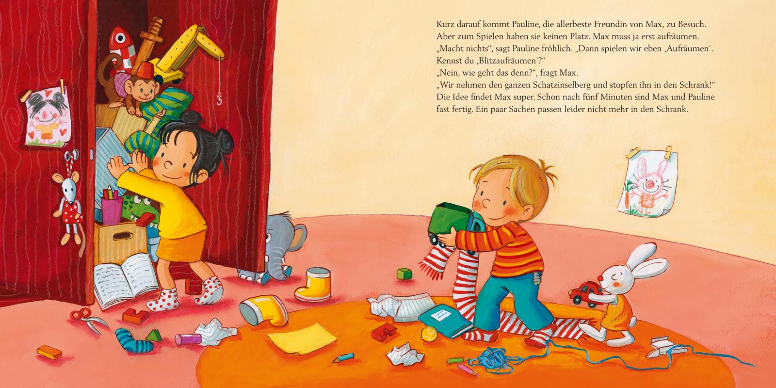 Max soll erst aufräumen, bevor er mit Pauline spielen kann. Dazu hat er überhaupt keine Lust. Der Spielzeugberg auf dem Boden ist viel zu groß. Aber zusammen mit Pauline und ein wenig Hilfe von Papa sieht das Kinderzimmer schnell wieder ordentlich aus.
