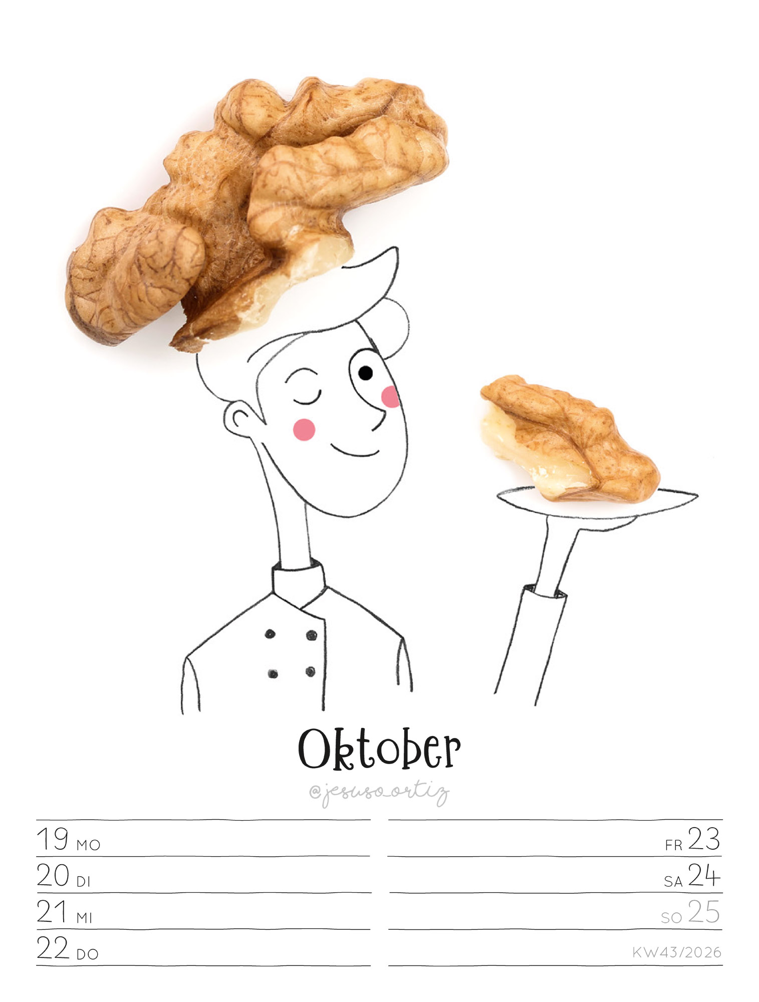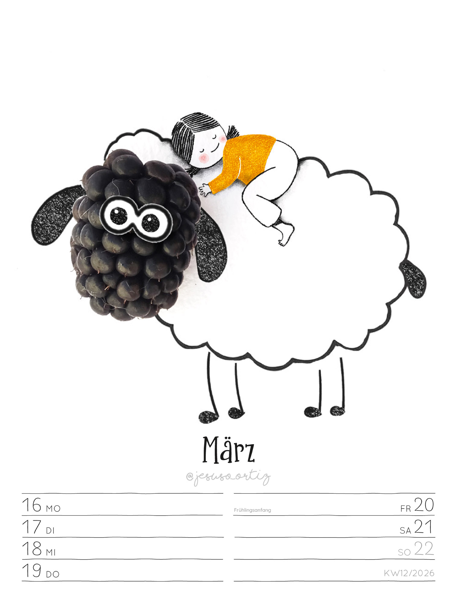 Fantasievoll anders kombiniert der spanische Künstler Jesuso Ortiz zweidimensionale Zeichnungen mit dreidimensionaler Fotografie. Mit nur wenigen Strichen und einfachen Alltagsgegenständen, Blüten oder Früchten schenkt er uns 53 kleine poetische Alltagsaugenblicke. Ortiz liebt es dabei, mit unterschiedlichen Stilen, Materialien, Formen und Farben zu experimentieren. Die kreativen Illustrationen bieten dem Auge viele Überraschungen und dem Geist von Kindern und Erwachsenen eine große Portion Inspiration. Übersichtliches Kalendarium mit Platz für Ihre Einträge. Wie alle Ackermann-Kalender ausschließlich in Deutschland auf Papier gedruckt, das aus vorbildlich bewirtschafteten, FSC®-zertifizierten Wäldern und anderen kontrollierten Quellen stammt. Transparente CO₂-Kompensation in Kooperation mit unserem Klimapartner NatureOffice, bei der nachweislich Treibhausgase reduziert sowie die lokale Umwelt und die Belange der Bevölkerung gefördert werden.