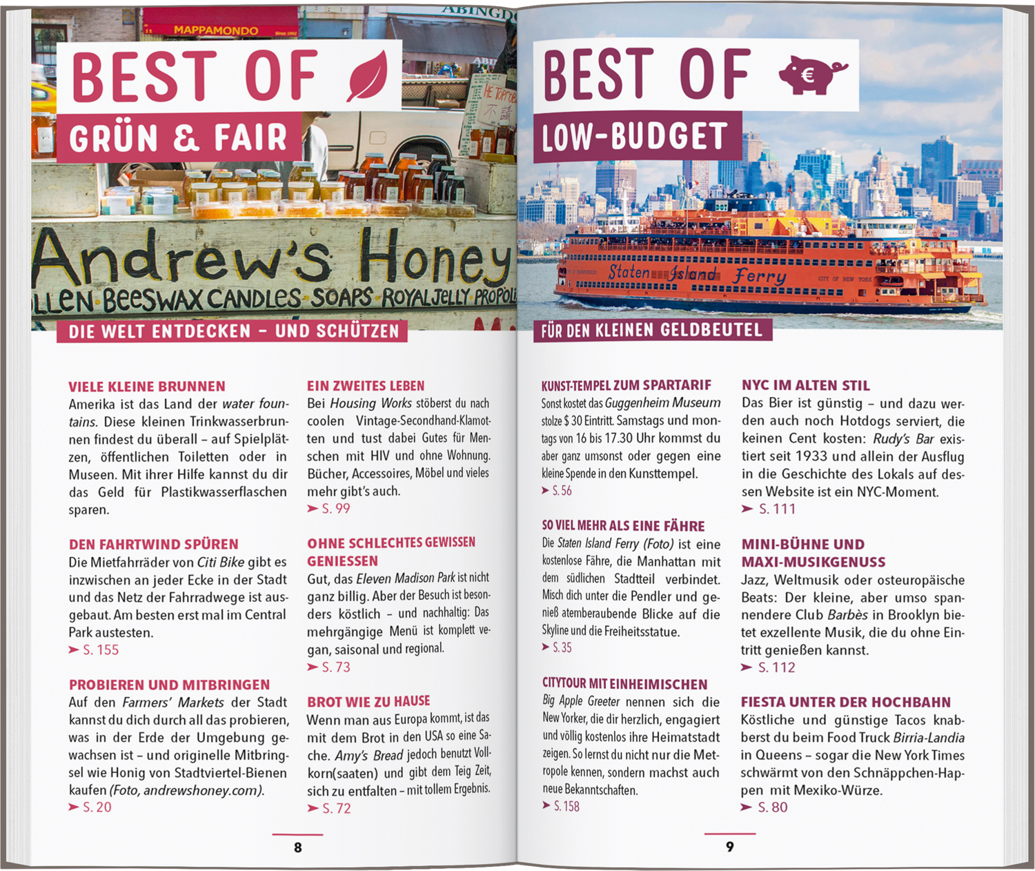 In New York brodelt Tag und Nacht das Leben. Damit du kein Must-see verpasst, macht dein MARCO POLO Reiseführer New York die Planung deines Traumurlaubs maximal einfach. Hier findest du alles Wissenswerte zur Stadt, Tipps zu Hotels und Restaurants, Infos zur Anreise und zum ÖPNV. Mit den übersichtlichen Stadtplänen findest du dich im Straßennetz des Big Apple schnell zurecht und stellst dir im Handumdrehen deine Lieblingstouren durch die Megacity zusammen.