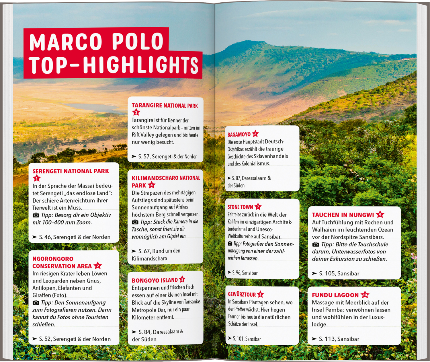 Genieße weite Strände, exotische Düfte und Bongo-Beats in Tansania und Sansibar! Mit dem MARCO POLO Reiseführer im Gepäck zeigt sich Ostafrika von seiner schönsten Seite.