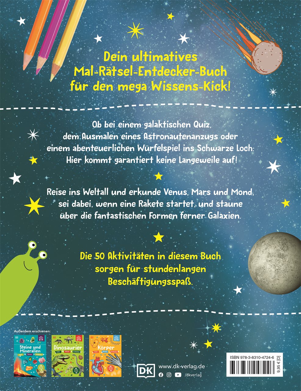 Ausmalen, spielen, Rätsel lösen – und ganz nebenbei Erstaunliches über das Weltall erfahren! Mit der Mitmach-Wissens-Kick-Reihe für Kinder ab 6 kommt garantiert keine Langeweile auf. Jede Seite enthält neben mitreißenden Aktivitäten Wissenswertes über absolute Lieblingsthemen. In diesem Buch würfeln sich Kinder ins Schwarze Loch, zeichnen eine Mars-Sonde und verknüpfen Galaxie-Formen mit Originalaufnahmen der NASA. Wissen, Kreativität und Spaß für viele Stunden!