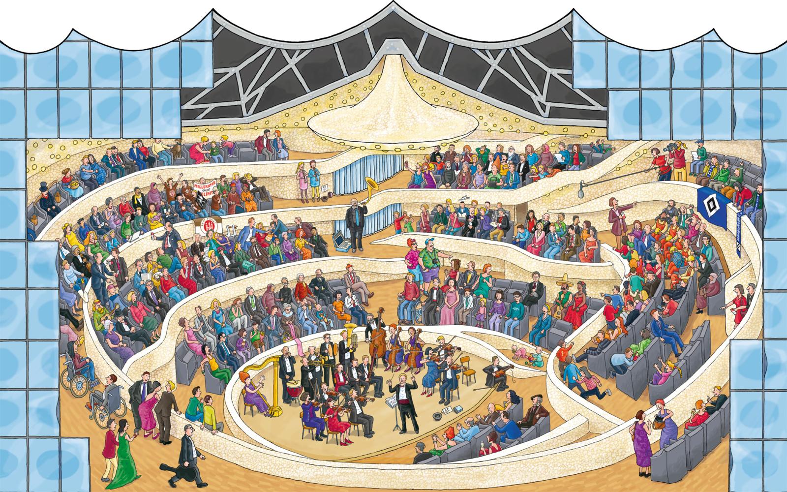"Auf den liebevoll gezeichneten Riesenbildern können Kinder das Konzerthaus [...] entdecken und hinter Papptürchen luschern."