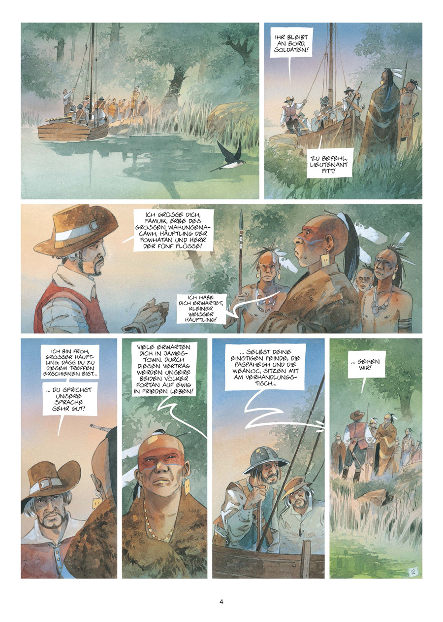 Im Jahr 1621 soll nach langen Konflikten ein Friedensvertrag zwischen den Indianerstämmen der Virginia-Algonkin und den Kolonisten des Forts Jamestown geschlossen werden. 14 Jahre zuvor waren die Engländer in Nordamerika angelandet, um das britische Empire zu erweitern und Gold zu finden – und einen Fluss, der nach China führt. Die Lage ist angespannt, denn beide Seiten mussten über die Jahre Verluste hinnehmen und keine von beiden kann oder will der anderen wirklich vertrauen. Eine unwahrscheinliche Liebesgeschichte zwischen einem jungen Siedler, einem Hitzkopf, der in Gefangenschaft des Powhatan-Stammes gerät, und der willensstarken Lieblingstochter des Häuptlings könnte alles verändern. In seinem neuen Werk nimmt sich Patrick Prugne auf seine unnachahmlich kunstvolle Weise der Legende von Matoaka, besser bekannt als »Pocahontas«, an: die Häuptlingstochter der Powhatan, deren Leben so lückenlos dokumentiert ist und deren Schicksal dennoch zum zentralen Mythos für die Legitimation der gewaltsamen Eroberung Nordamerikas verklärt wurde.
