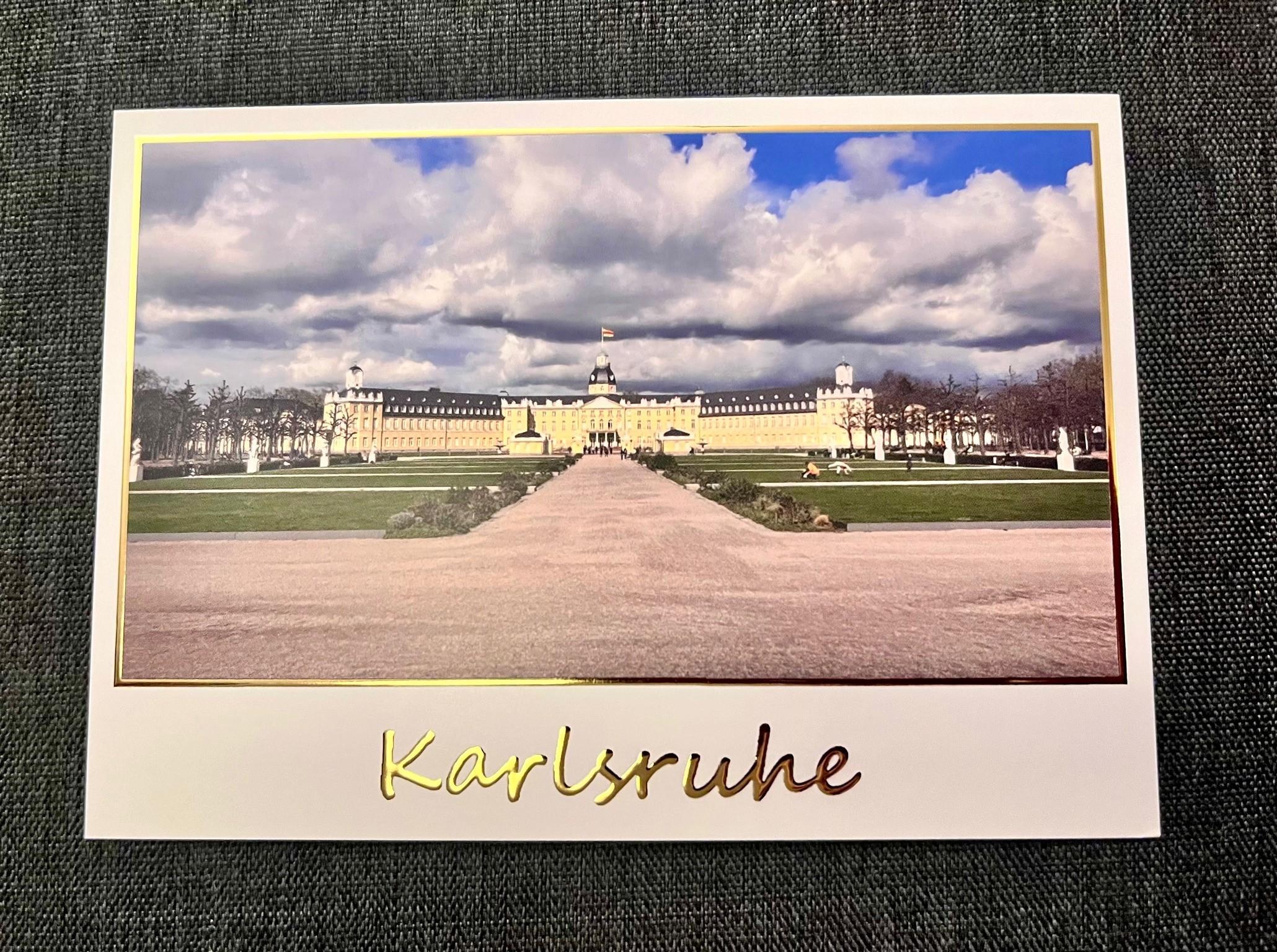 Grußpostkarte mit dem Karlsruher Schloss im Frühjahr als Motiv.