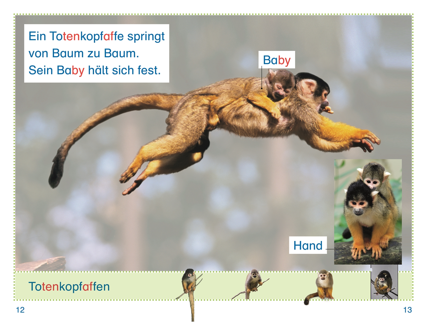 Dieses Erstlesebuch über das Leben der Affen eignet sich mit kurzen Sätzen, einfacher Sprache und extra großer Fibelschrift perfekt zur Leseförderung. Farbig markierte Silben, ein praktisches Lesebändchen und ein übersichtliches Glossar zum Nachschlagen der Wörter erleichtern das Lesenlernen – und mit dem Mix aus fesselnder Erzählung und spannendem Sachwissen zu verschiedenen Affenarten, kreativen Extras und einem Quiz macht Lesen üben gleich dreimal so viel Spaß!