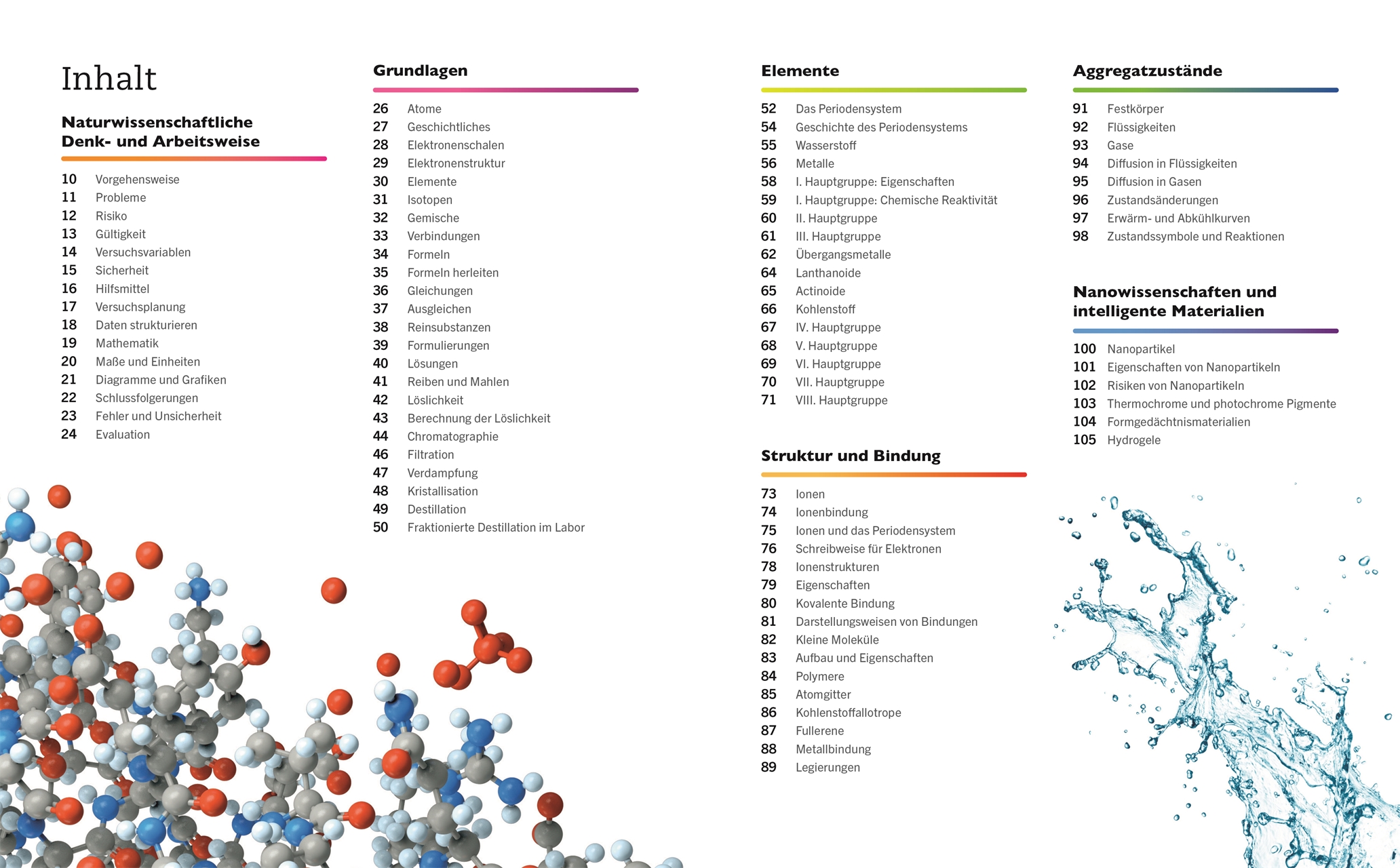 - Alle wichtigen Themen und Verfahren der Chemie: Anschauliche Doppelseiten erwecken die Wissenschaft zum Leben und erleichtern Schüler*innen den Einstieg in die Materie – von der Kristallisation über das Periodensystem bis zu Nanopartikeln.
