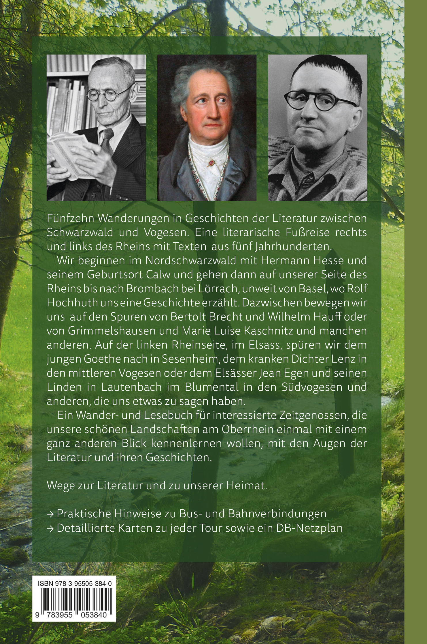 Fünfzehn Wanderungen in Geschichten der Literatur zwischen Schwarzwald und Vogesen. Eine literarische Fußreise rechtsund links des Rheins mit Texten aus fünf Jahrhunderten. Wir beginnen im Nordschwarzwald mit Hermann Hesse und seinem Geburtsort Calw und gehen dann auf unserer Seite des Rheins bis nach Brombach bei Lörrach, unweit von Basel, wo Rolf Hochhuth uns eine Geschichte erzählt. Dazwischen bewegen wir uns auf den Spuren von Bertolt Brecht und Wilhelm Hauff oder von Grimmelshausen und Marie Luise Kaschnitz und manchen anderen. Auf der linken Rheinseite, im Elsass, spüren wir dem jungen Goethe nach in Sesenheim, dem kranken Dichter Lenz in den mittleren Vogesen oder dem Elsässer Jean Egen und seinen Linden in Lautenbach im Blumental in den Südvogesen und anderen, die uns etwas zu sagen haben. Ein Wander- und Lesebuch für interessierte Zeitgenossen, die unsere schönen Landschaften am Oberrhein einmal mit einem ganz anderen Blick kennenlernen wollen, mit den Augen der Literatur und ihren Geschichten. Wege zur Literatur und zu unserer Heimat. → Praktische Hinweise zu Bus- und Bahnverbindungen → Detaillierte Karten zu jeder Tour sowie ein DB-Netzplan