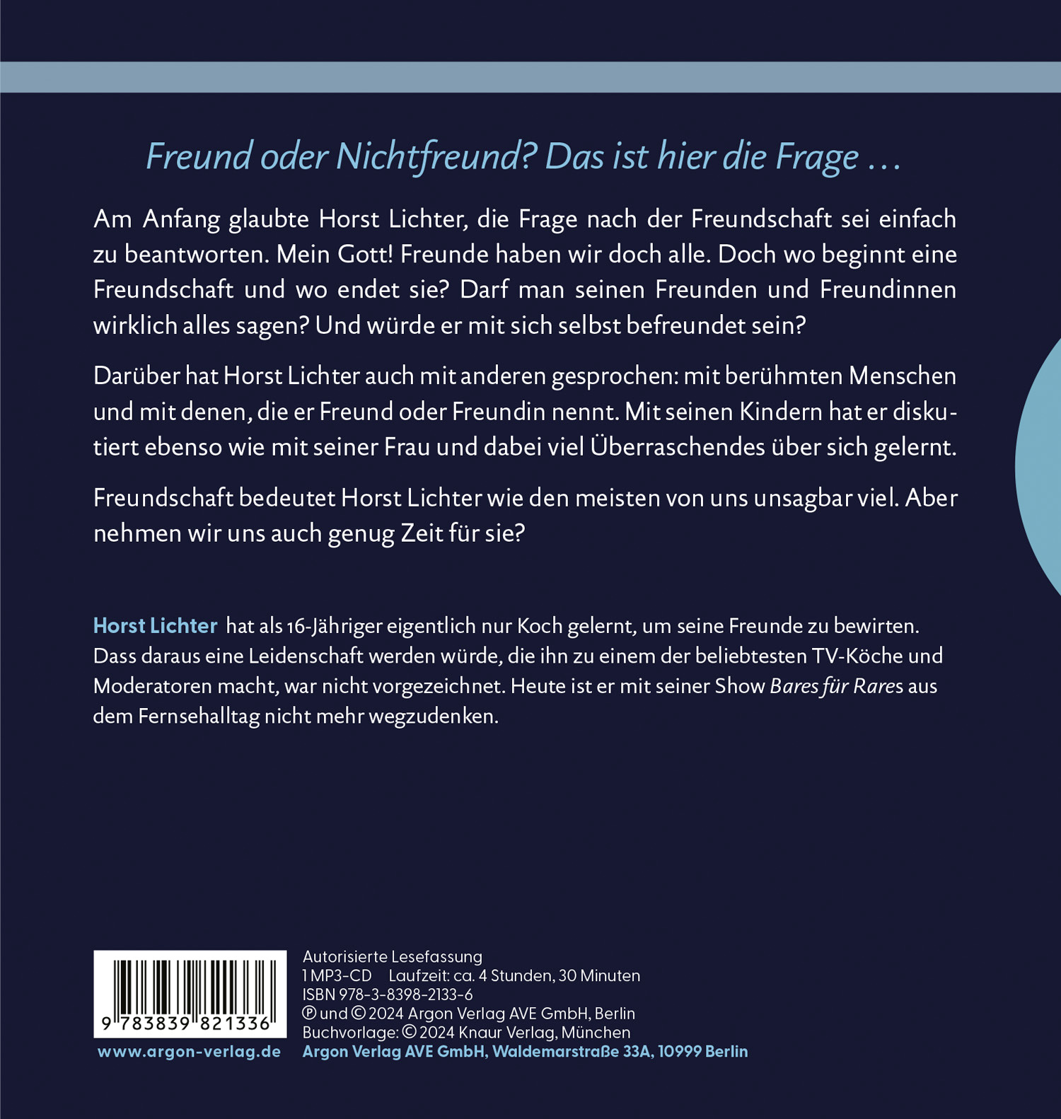Auch als vielbeschäftigter Erwachsener hat sich Horst Lichter stets Orte geschaffen, an denen er den Menschen nahe sein konnte: ob in seinem Restaurant Oldiethek, im Fernsehstudio der legendären Sendung »Lafer! Lichter! Lecker!« oder heute als Gastgeber des Erfolgsformats »Bares für Rares«. Und doch fragt sich Horst Lichter manchmal: Gibt es überhaupt so etwas wie eine richtige Freundschaft? Und würde er sich selbst als Freund haben wollen?