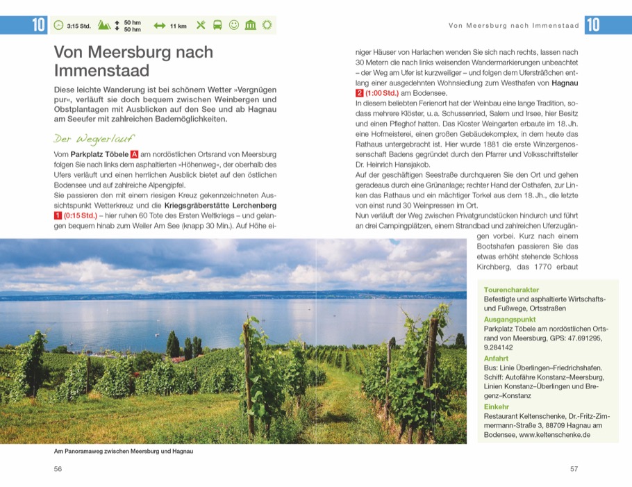 Blumengeschmückte Städte und Dörfer, Uferpromenaden, Jachthäfen, Strandbäder und ein dichtes Wanderwegenetz – die Bodensee-Region lässt sich gut zu Fuß erkunden. 40 abwechslungsreiche und meist kindgerechte Touren führen Sie am Seeufer entlang, durch Weinberge und Naturschutzgebiete, in Schluchten und auf Bergrücken. Dabei ist überall etwas Besonderes zu finden: Burgruinen, Ausflugslokale, ein schönes Städtchen oder ein Aussichtspunkt.