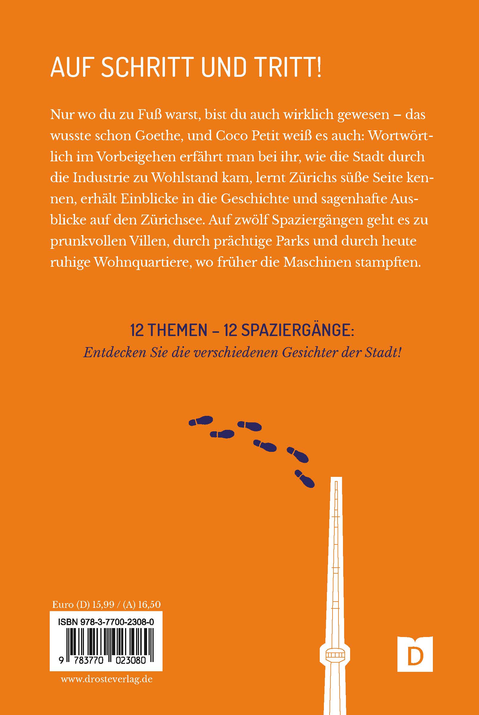Nur wo du zu Fuß warst, bist du auch wirklich gewesen – das wusste schon Goethe, und Coco Petit weiß es auch: Wortwörtlich im Vorbeigehen erfährt man bei ihr, wie die Stadt durch die Industrie zu Wohlstand kam, lernt Zürichs süße Seite kennen, erhält Einblicke in die Geschichte und sagenhafte Ausblicke auf den Zürichsee. Auf zwölf Spaziergängen geht es zu prunkvollen Villen, durch prächtige Parks und durch heute ruhige Wohnquartiere, wo früher die Maschinen stampften.