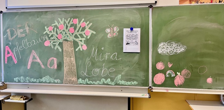 Was für ein schöner Vormittag. Gemeinsam im Chor riefen die Kinder der Apfelbaum und hatten viel Freude an der Geschichte. Eine tolle Überraschung war, der Apfelbaum mit vielen kleinen, roten Äpfeln direkt vor dem Fenster des Klassenzimmers.